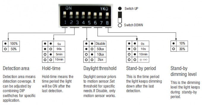 Het licht gaat aan wanneer mensen het detectiebereik binnenkomen. Nadat mensen het bereik hebben verlaten, blijft het licht nog een tijdje branden, ook wel de "wachttijd" genoemd. Na de "wachttijd" blijft het licht een laag lichtniveau geven en blijft het nog een tijdje branden, ook wel de "stand-by-dimming" en "stand-byperiode" genoemd. Na de stand-byperiode gaat het licht uit.