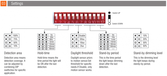Daglichtsensor | 2Lux/10Lux/50Lux/Uitschakelen | |